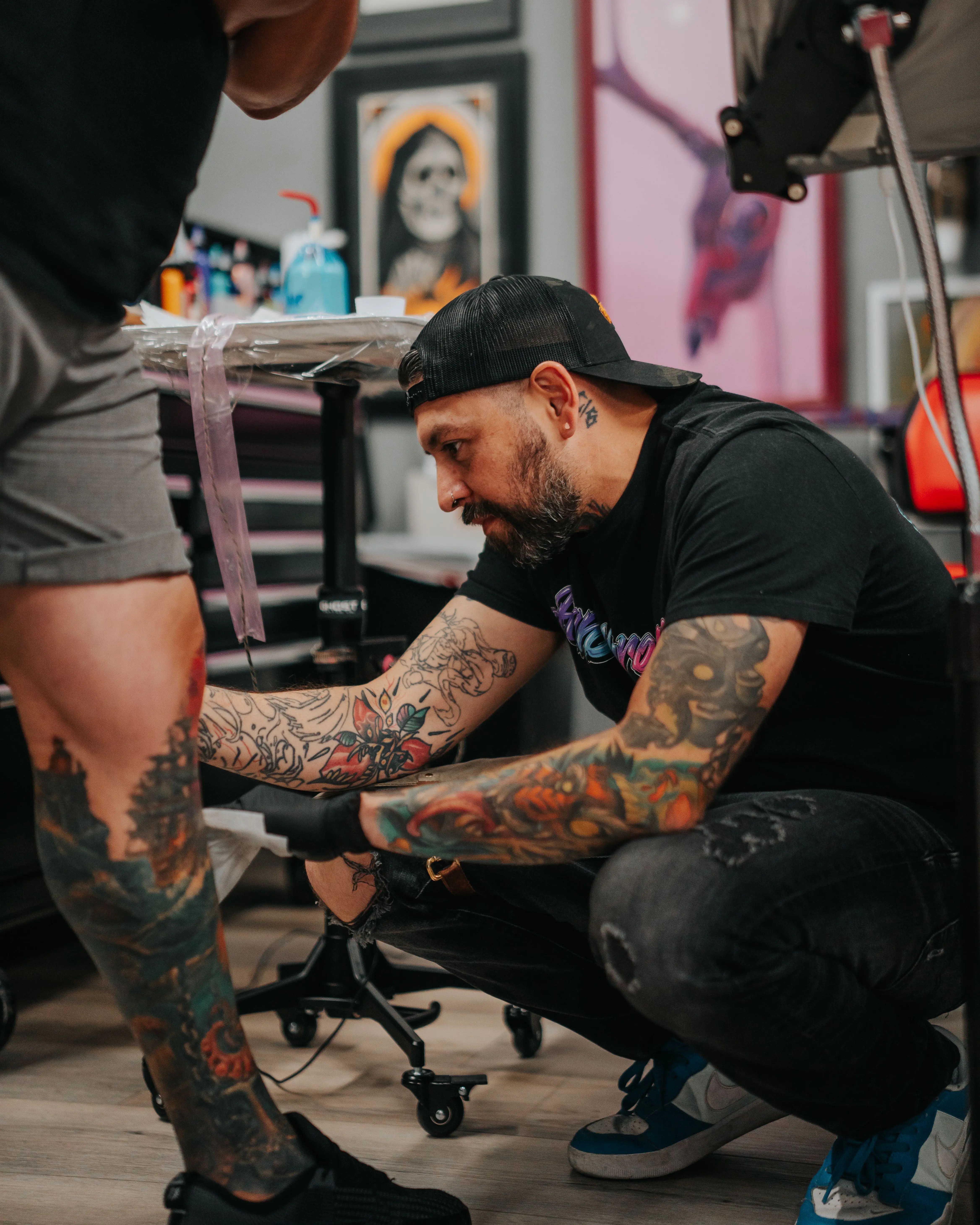 Born to a long line of artists and musicians Aldo Gallegos spent his youth surrounded with the inspiration that eventually led him into the world of tattoo art where he continues to dominate today. Since 2006 he’s learned everything from black work to portraits and realism ultimately leading him into honing his craft with a focus on the style of illustrative new school tattoos. Aldo’s tattoo art tells a story visually and takes the collector on a journey of emotions solidifying a dedication to ownership and pride that they can carry with them for years to come. At their core these creations are cartoon based but the skills he’s cultivated through the years give him the ability to render each texture, surface and detail to make the mind of the viewer believe that each subject could in fact be a reality. The freedom to create everything from subject matter to lighting and dimension to atmosphere is something that Aldo wears like a badge of honor and he strives to push the envelope with each upcoming project. He proudly represents Albuquerque tattoo art, but can also be found in a city near you on one of his many yearly tattoo tour stops which can be found by following his social media accounts.